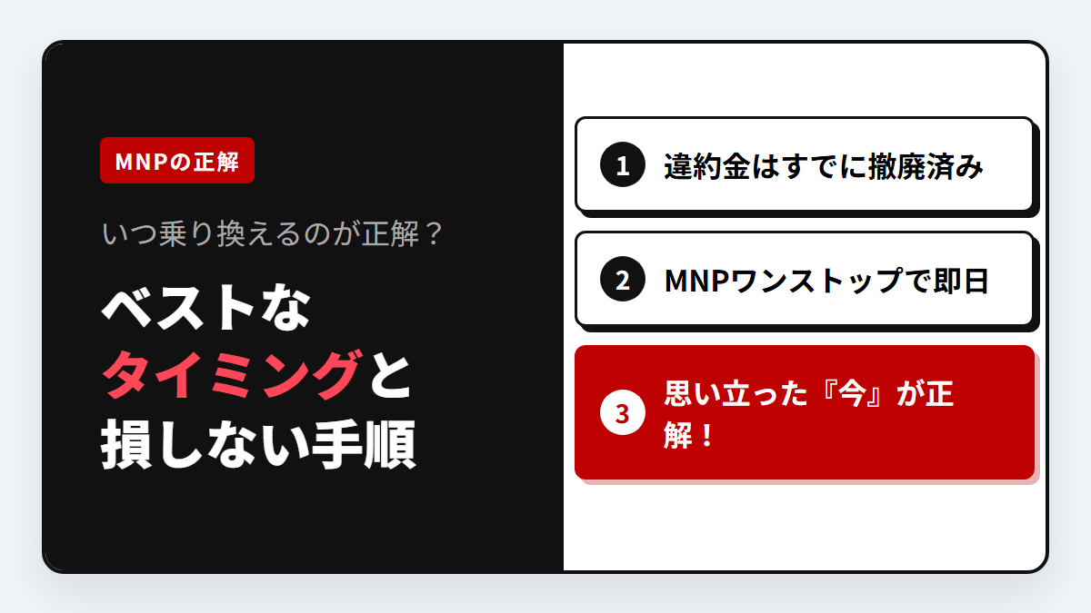 携帯会社の乗り換え(MNP)で最も多い悩みが「タイミング」です。「日割りが効かないから月末まで待とう」「解約時の違約金が…」と調べているうちに面倒になり、そのまま放置してしまう方は非常に多いです。